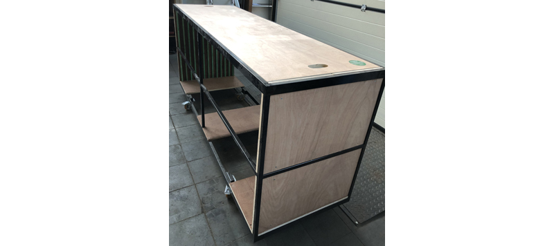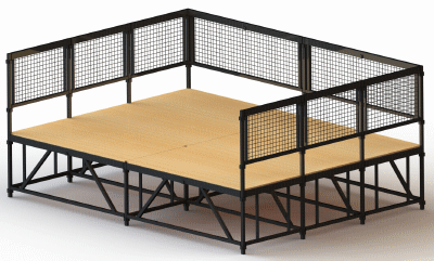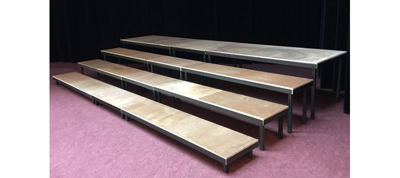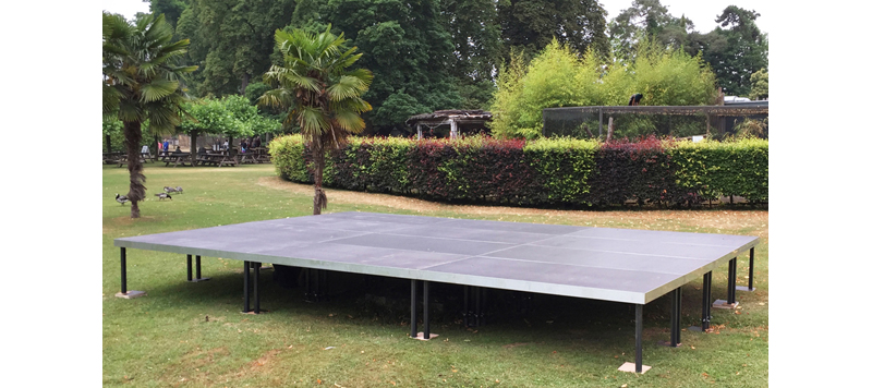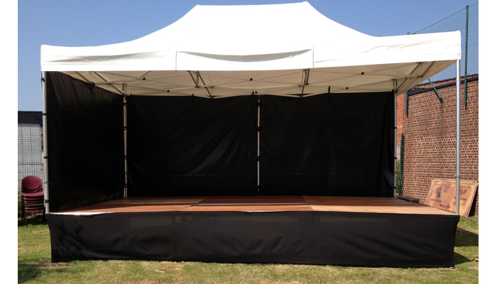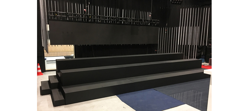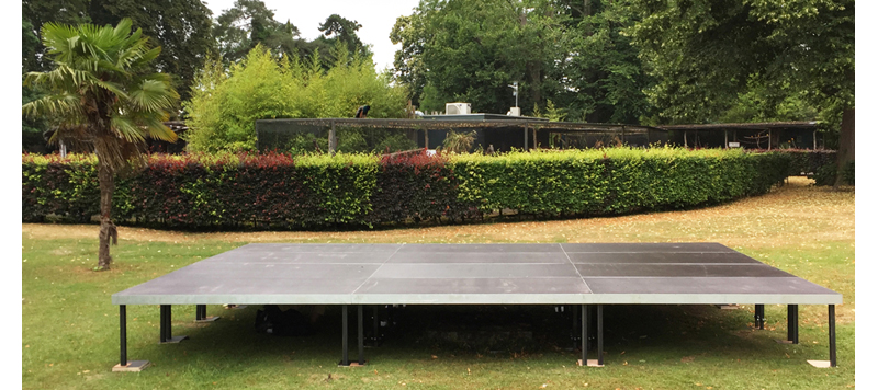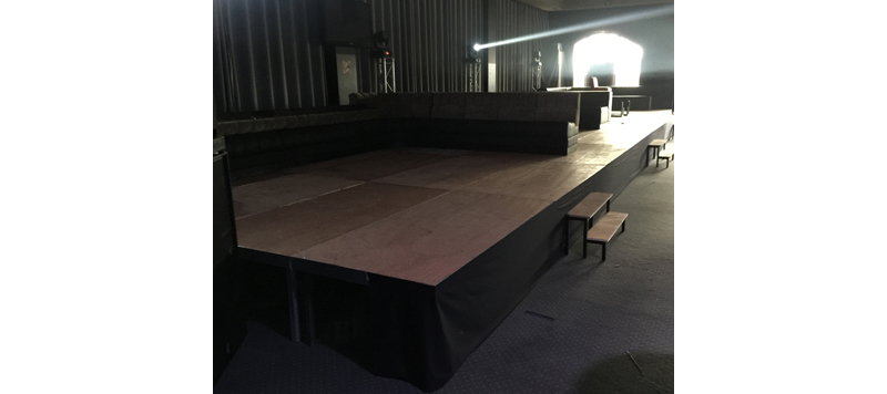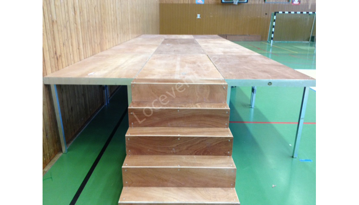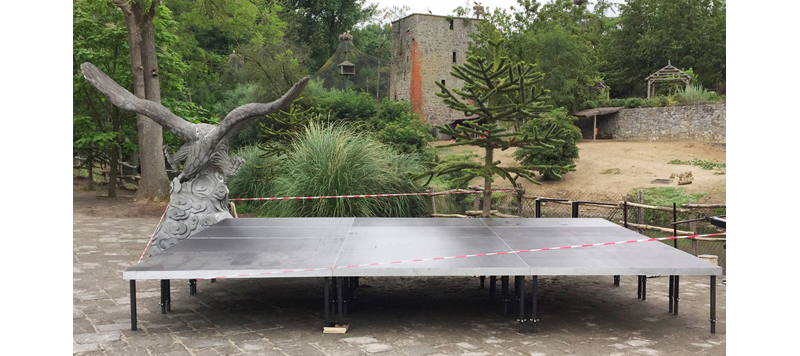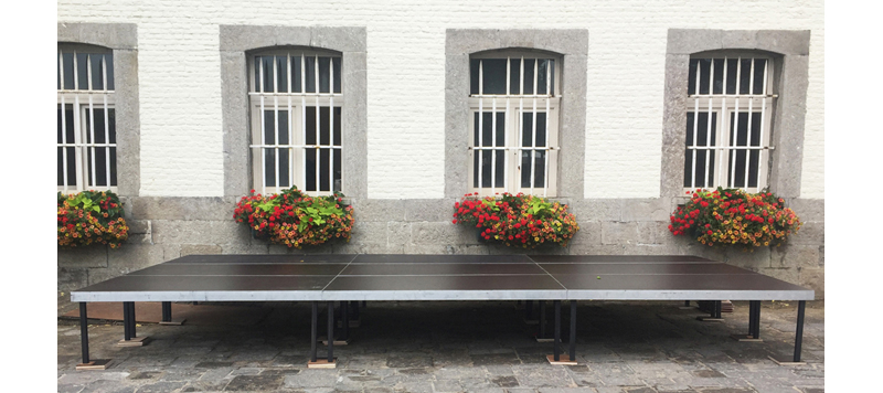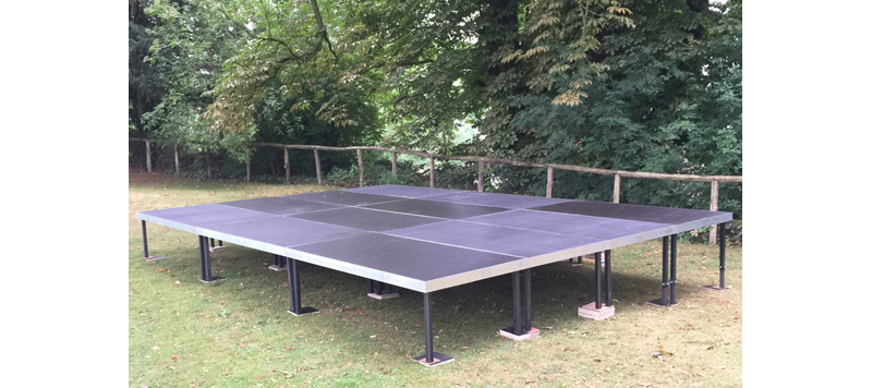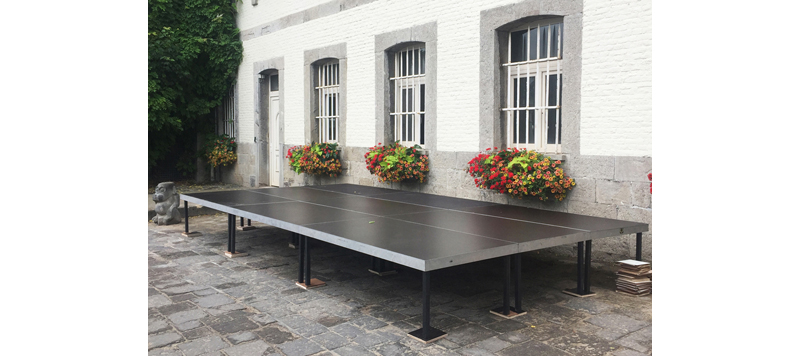 Podium de 32m² + pieds en métal de 20,40,60,80 et 100cm + escalier + chariot pour 4820 euros HTVA